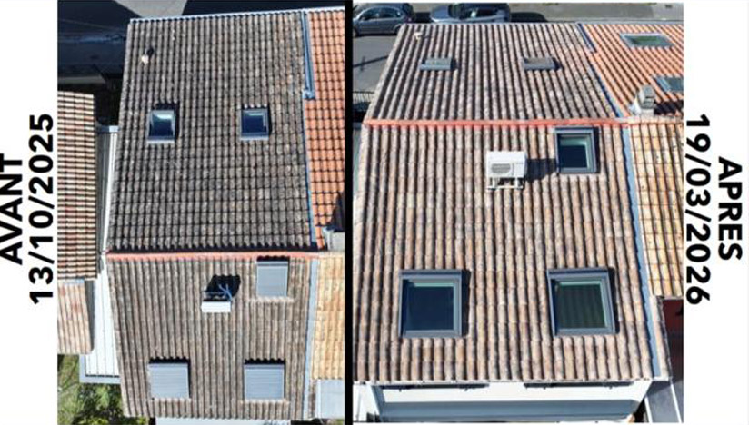 - Balayage mécanisé de la toiture pour retirer les mousses et résidus en surface